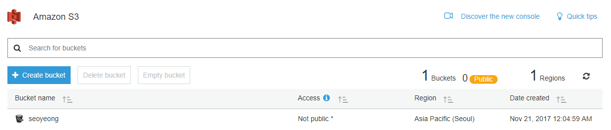 AWS Mangaement Console 에서 S3를 선택한 뒤 Create Bucket 버튼을 클릭합니다.