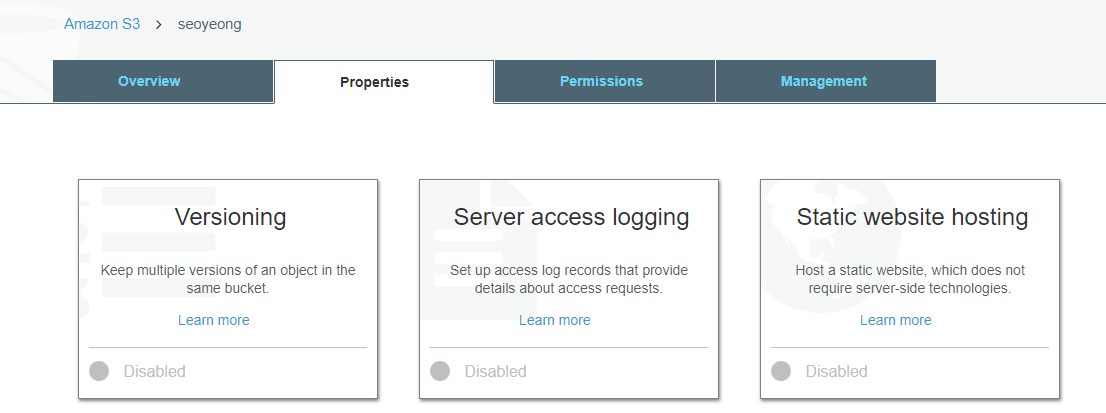 생성된 Bucket의 이름을 클릭하여 속성 설정 페이지로 이동합니다.